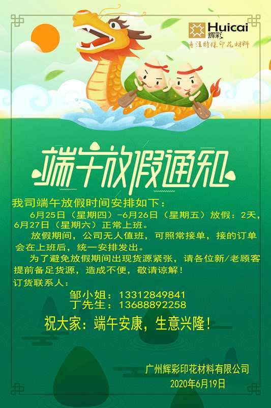 溫馨提示:【輝彩公司】端午節(jié)放假時(shí)間為:6月25-26日、27號(hào)正常上班,放假期間,可照常接單,如需訂貨可聯(lián)系:13312849841鄒經(jīng)理,祝大家節(jié)日安康!