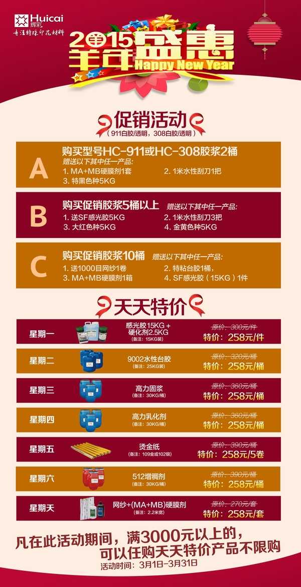 新年快樂!開工啦,輝彩印花材料于正月11正式開工啦,感謝各位新老客戶多年的支持,在此 輝彩全體員工恭祝新老客戶2015年:一帆風(fēng)順,財(cái)運(yùn)亨通,羊年大吉大利!