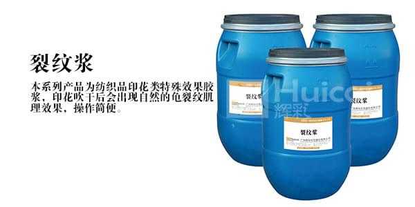 裂紋漿是我公司針對印花市場多樣化需求而研發(fā)推出的一款特殊膠漿,是由高分子特殊樹脂、顏料、助劑復合而成。使用該產品印制出的圖案具有裂紋自然,表面平滑,手感柔軟,彈性好,牢度高之特點,產品不含鄰苯二甲酸鹽、PVC、甲醛、及有害重金屬。