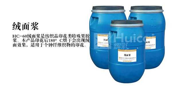 輝彩絨面漿是紡織品印花類特殊果膠漿,由特殊樹脂、助劑組成,用本產(chǎn)品印花后180度C烘干會出現(xiàn)絨面效果,適用于各種纖維織物的印花。此產(chǎn)品仿絨面效果,絨面均勻,立體感強,表面平滑,手感柔軟,富有彈性,牢固度高,不含鄰苯二甲酸鹽、PVC、APEO;不含甲醛和有害重金屬,不含溶劑,符合歐盟、美國、日本環(huán)保要求。