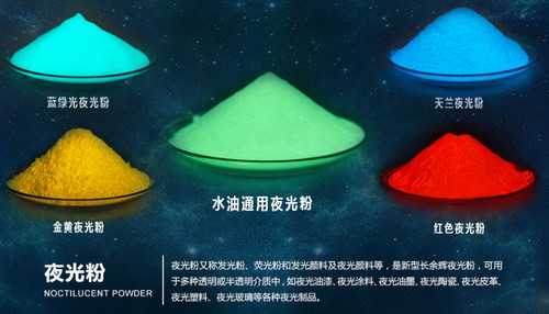 夜光粉,通常分為光致儲能夜光粉和帶有放射性的夜光粉兩類。光致儲能夜光粉是熒光粉在受到自然光、日光燈光、紫外光等照射后,把光能儲存起來,停止光照射后,再緩慢地以熒光的方式釋放出來,所以在夜間或者黑暗處,仍能看到發(fā)光,持續(xù)時間長達幾小時至十幾小時。