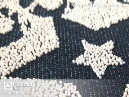 先印輝彩印花材料的HC-800粘珠漿一次吹干打底,然后再印第二次時以膠珠的大小來確定印粘珠漿的厚度,或是印第三次粘珠漿以便留有足夠的粘珠漿