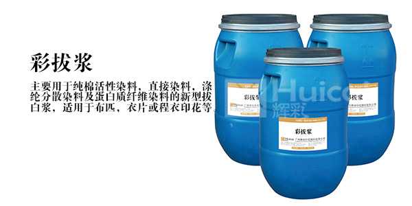 輝彩彩拔漿專門用于拔印工藝印花,其流動性非常好,不塞網(wǎng),質(zhì)量穩(wěn)定,可達(dá)到高質(zhì)素的彩拔效果。使用方便、工藝簡單,印花后焙烘或壓燙即可,具有高亮度和很有效的可拔印性。