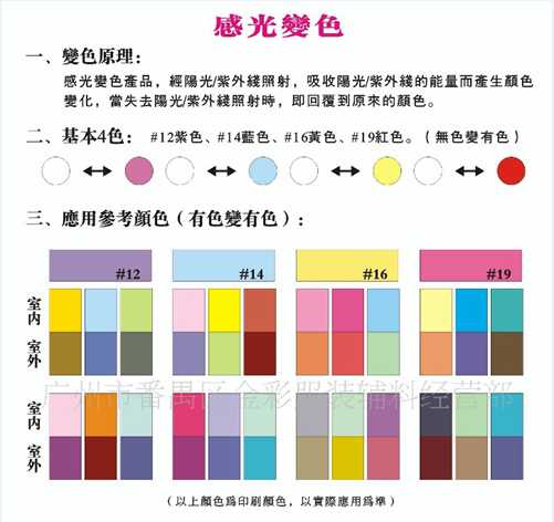 感光變色是經(jīng)紫外線或陽光照射,吸收紫外線或陽光后,而產(chǎn)生顏色的變化,當失去紫外線或陽光照射時,即回復到原來的顏色。