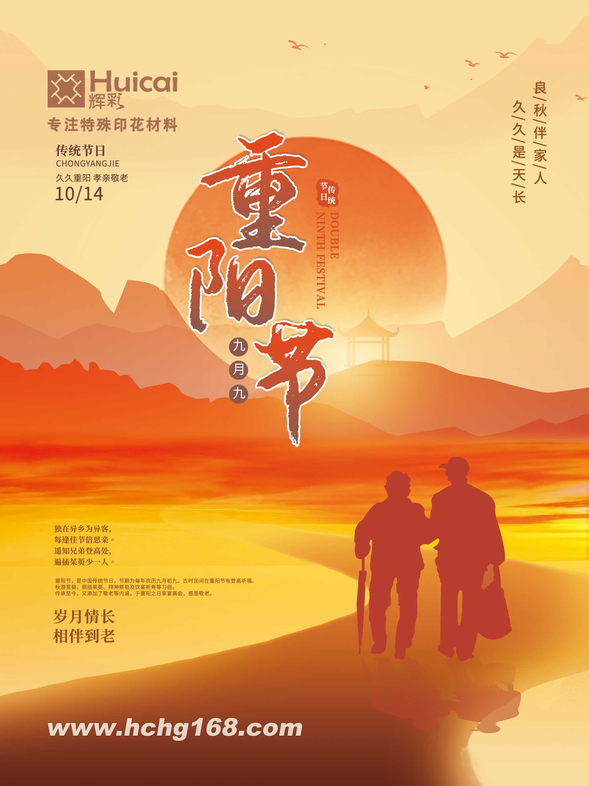 今天是2021年農(nóng)歷九月初九,是我國的傳統(tǒng)節(jié)日重陽節(jié),又稱重九節(jié)、曬秋節(jié)、“踏秋”。“九”數(shù)在《易經(jīng)》中為陽數(shù),“九九”兩陽數(shù)相重,故曰“重陽”;因日與月皆逢九,故又稱為“重九”。古時民間在重陽節(jié)有登高祈福、秋游賞菊、佩插茱萸、拜神祭祖及飲宴祈壽等習俗。傳承至今,又添加了敬老等內(nèi)涵,于重陽之日享宴高會,感恩敬老,登高賞秋與感恩敬老是當今重陽節(jié)日活動的兩大重要主題。重陽佳節(jié),輝彩印花全體員工祝福全天下老人健康長壽,愿家人幸福安康!