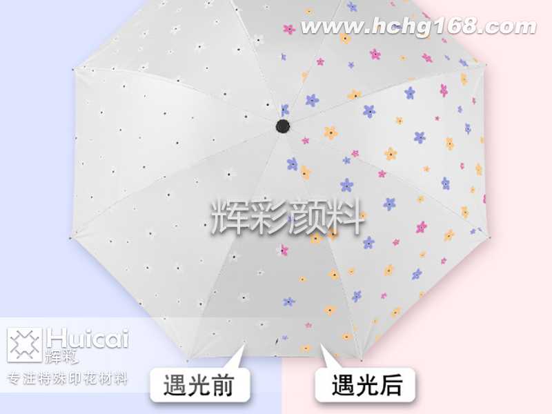 這種加入了感光變色粉的太陽傘在光的照射下變得與眾不同,在千篇一律的太陽傘中激起了一點(diǎn)小小的趣味浪花,為生活增添色彩。科技改變生活,同時(shí)也把我們領(lǐng)進(jìn)一個(gè)全新的社會(huì),變色顏料在各行業(yè)中的應(yīng)用也在不斷改變我們的生活。感光變色粉又稱光變粉、光變顏料、光變色粉等,是使用微膠囊技術(shù)加工制備的光變材料,外觀為粉狀,平均粒徑為3±1 μm,使用簡單,適用性廣,光變粉基本色有十幾種顏色,如葡萄紫、湖藍(lán)色、檸檬黃、樹莓紅等,環(huán)境耐受性和抗光老化性能高。加入光變粉的太陽傘在經(jīng)過陽光/紫外線照射后、產(chǎn)生顏色變化;當(dāng)失去陽光/紫外線后會(huì)還原回原本的顏色,從而實(shí)現(xiàn)顏色轉(zhuǎn)變。變色太陽傘就充分運(yùn)用了光變粉的變色原理,在遇光之后實(shí)現(xiàn)從“無色--有色”狀態(tài)的顏色變化。
