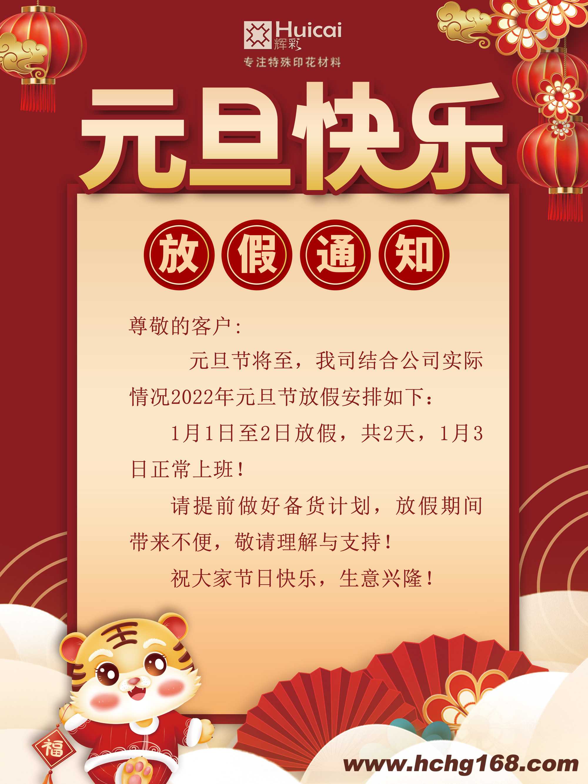 根據(jù)《國務院辦公廳關于2022年部分節(jié)假日安排的通知》,并結合我司實際情況,輝彩印花材料廠家現(xiàn)將2022年元旦放假日期安排通知如下: