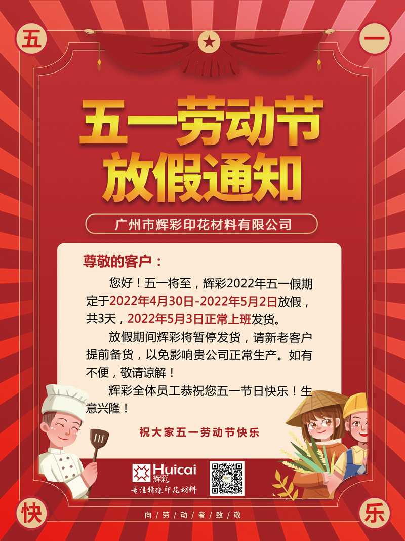 每一滴汗水都折射太陽的光芒,每一份付出都照亮夢想的天空。尊重每一份職業(yè),也感謝每一次堅(jiān)守。即將迎來五一勞動(dòng)節(jié),輝彩印花材料向每一個(gè)努力生活的人致敬!