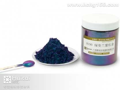 8190綠變蘭紫紅金變色龍粉其變色原理為吸收特定波長(zhǎng)之紫外光源,藉由該光源之能量而產(chǎn)生顏色變化(變?yōu)樽仙?、紅色、黃色、天空蘭色),當(dāng)特定波長(zhǎng)的紫外光源不在時(shí),即回復(fù)原來的顏色。